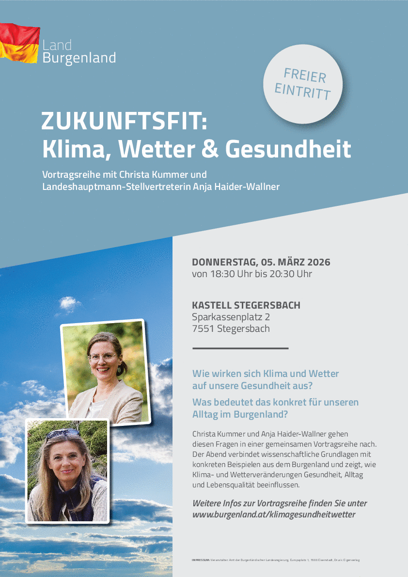 STEGERSBACH. Im Rahmen dieser Vortragsreihe werden verständlich aufbereitet, wie sich Klima und Wetter auf unsere Gesundheit auswirken und was diese Veränderungen konkret für den Alltag im Burgenland bedeuten. Die Veranstaltung vermittelt fundierte Einblicke zu aktuellen klimatischen Entwicklungen und deren gesundheitlichen Folgen.